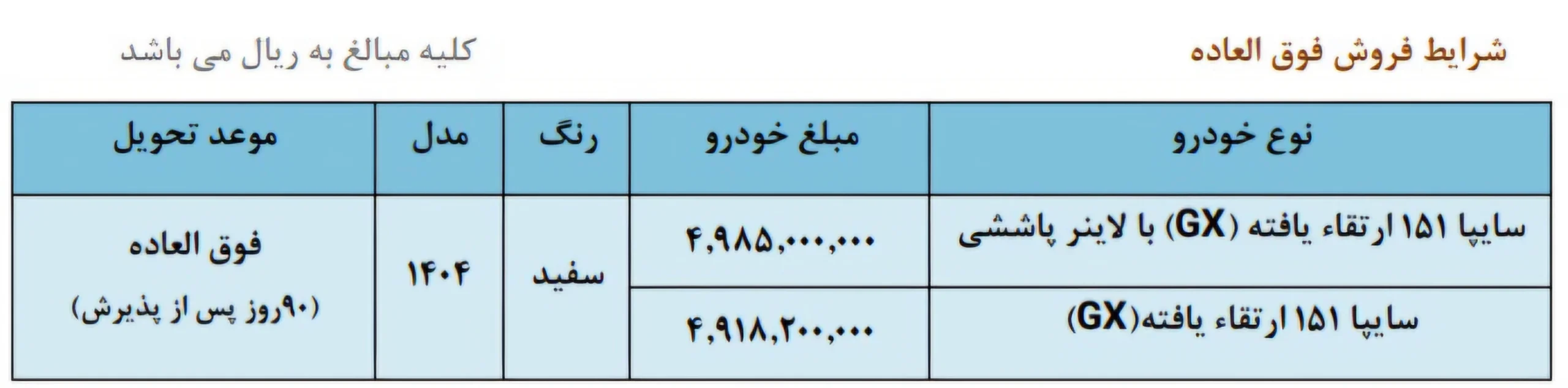 در این طرح فروش، وانت سایپا۱۵۱ ارتقاءیافته (GX) با لاینر پاششی، ۹۰ روز پس از پذیرش به مشتریان تحویل خواهد شد.