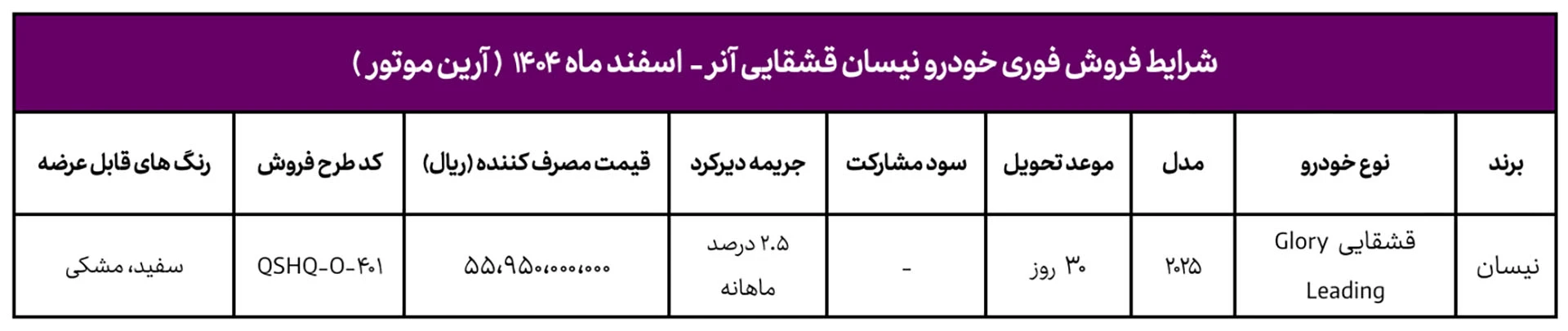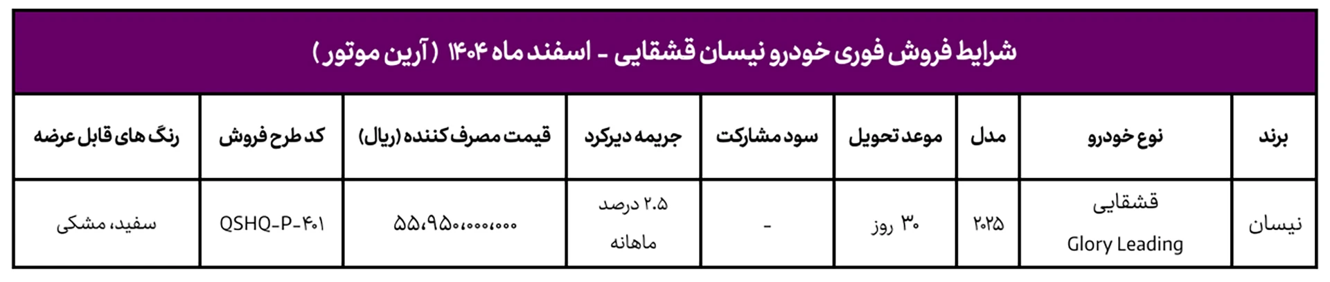 این طرح به صورت فروش فوری با قیمت قطعی اجرا میشود و موعد تحویل خودرو ۳۰ روز پس از تکمیل ثبتنام خواهد بود. محصول عرضهشده، نیسان قشقایی ۲۰۲۵ در تیپ Glory Leading است که با کد طرح فروش QSHQ-P-۴-۱ ارائه میشود. قیمت مصرفکننده این خودرو ۵۵ میلیارد و ۹۵۰ میلیون ریال تعیین شده است.