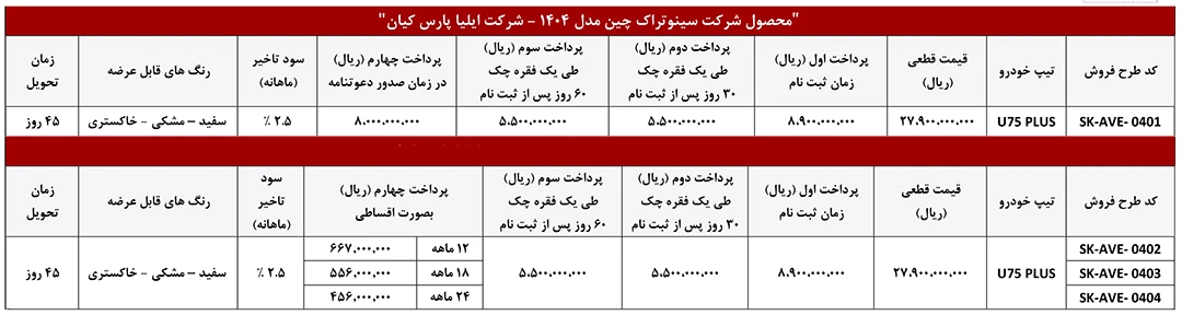 شرکت ایلیا کیان پارس (صنایع خودروسازی ایلیا) با انتشار بخشنامهای اولین مرحله پیشفروش نقدی و اعتباری خودروی اونترا U75 پلاس را اعلام کرد. این محصول قرار است با قیمت قطعی ۲۷.۹۰۰.۰۰۰.۰۰۰ ریال از روز شنبه ۱۲ مهرماه ۱۴۰4 به صورت پیشفروش عرضه شو و طرح فروش آن تا زمان تکمیل ظرفیت ادامه خواهد داشت.