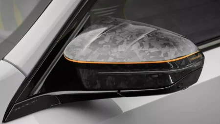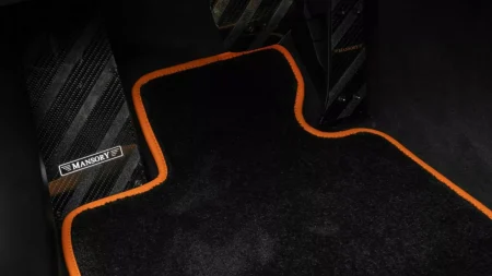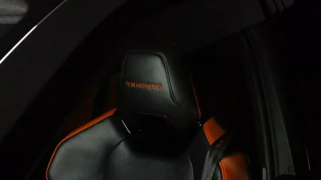در فضای داخلی کابین نیز منصوری همان هنرنمایی همیشگی خود را به اجرا گذاشته است؛ ترکیب چرم مشکی و نارنجی برای روکش صندلی‌ها و داشبورد، کف‌پوش‌های سفارشی و پوشش اسپرت برای پدال‌ها، جلوه‌ای ویژه به فضای داخلی بخشیده و حس لوکس بودن را با روحیه اسپرت درمی‌آمیزد.