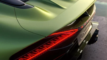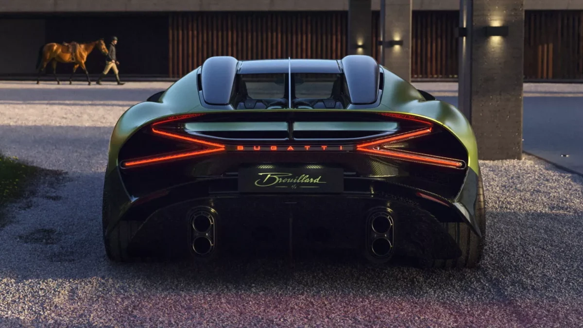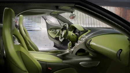 چهره جلو، با سپری پیکرتراشیده، جلوپنجره عظیم نعلاسبی و چراغهای LED ظریف بر تیغه گلگیرها، شکوهی پرصلابت دارد. ورودیهای هوای اضافی، نشانی از دقت وسواسگونه در خنککاری این غول قدرتمند هستند. نمای جانبی، با دریچههای C شکل پشت ستونها و بازی هنرمندانه فیبرکربن در کنار رنگ سبز درخشان، همانند امضایی اختصاصی بر قامت خودرو نشسته است. پشت خودرو، یک باله کوچک و یکپارچه، بیهیچ اغراق، هم آیرودینامیک را بهبود میبخشد و هم چشم را مینوازد. چراغهای X شکلی که الهامگرفته از میسترالاند و خروجیهای چهارگانه اگزوز یادآور شیرون، ترکیبی از گذشته و حال بوگاتی را بازآفرینی میکنند.