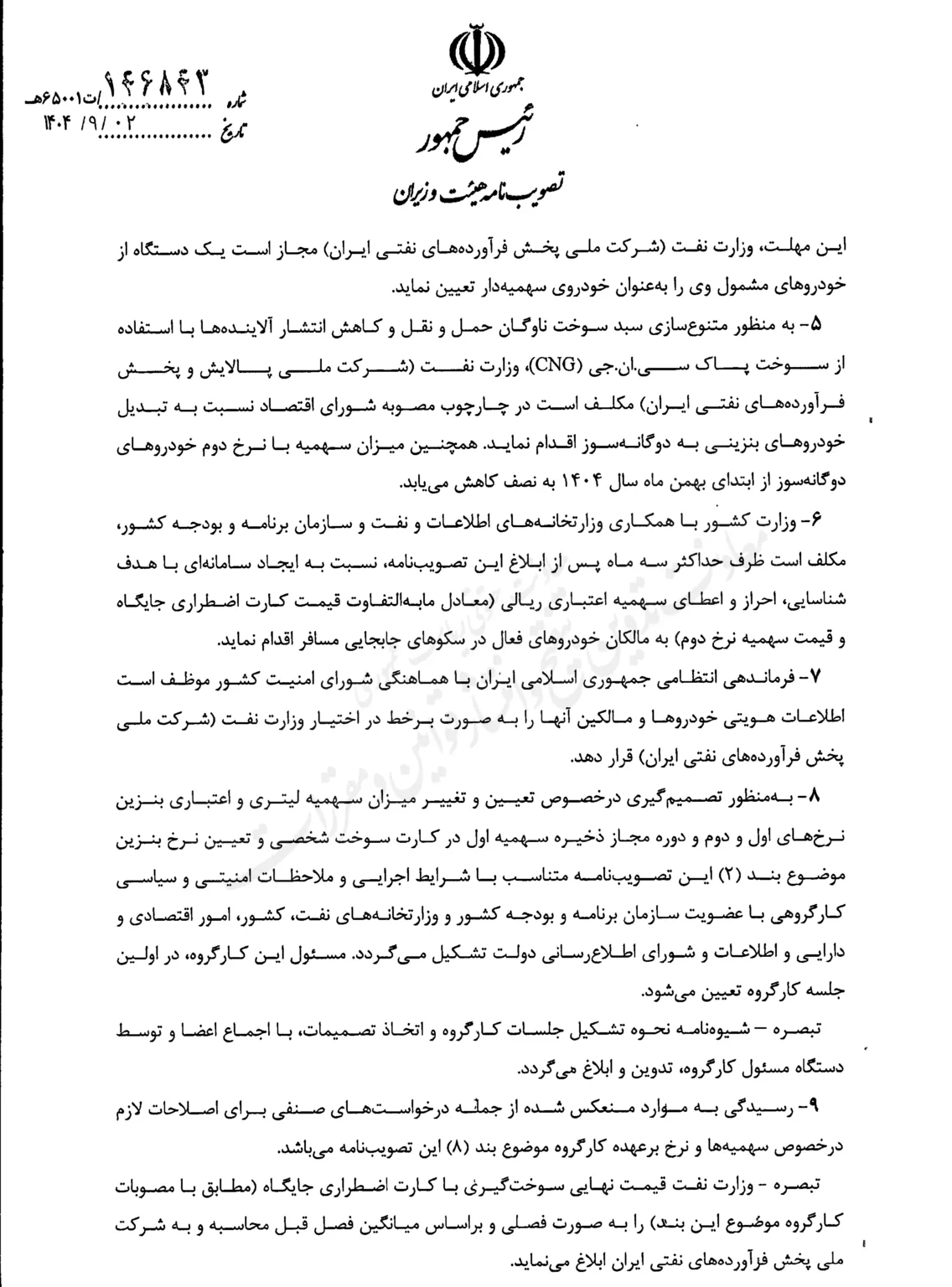 هیئت وزیران در جلسه مورخ ۱۴۰۴/۸/۱۴، به منظور لزوم استفاده حداکثری از کارت سوخت شخصی و جلوگیری از افزایش واردات بنزین، مصوباتی را به شرح زیر تصویب نمود. این مصوبات ساختار سهنرخی سوخت را تثبیت کرده و چارچوبهای جدیدی برای تخصیص سهمیهها تعریف مینماید. جزییات این مصوبه امروز ۴ آذر ۱۴۰۴ به شرح زیر منتشر شد: