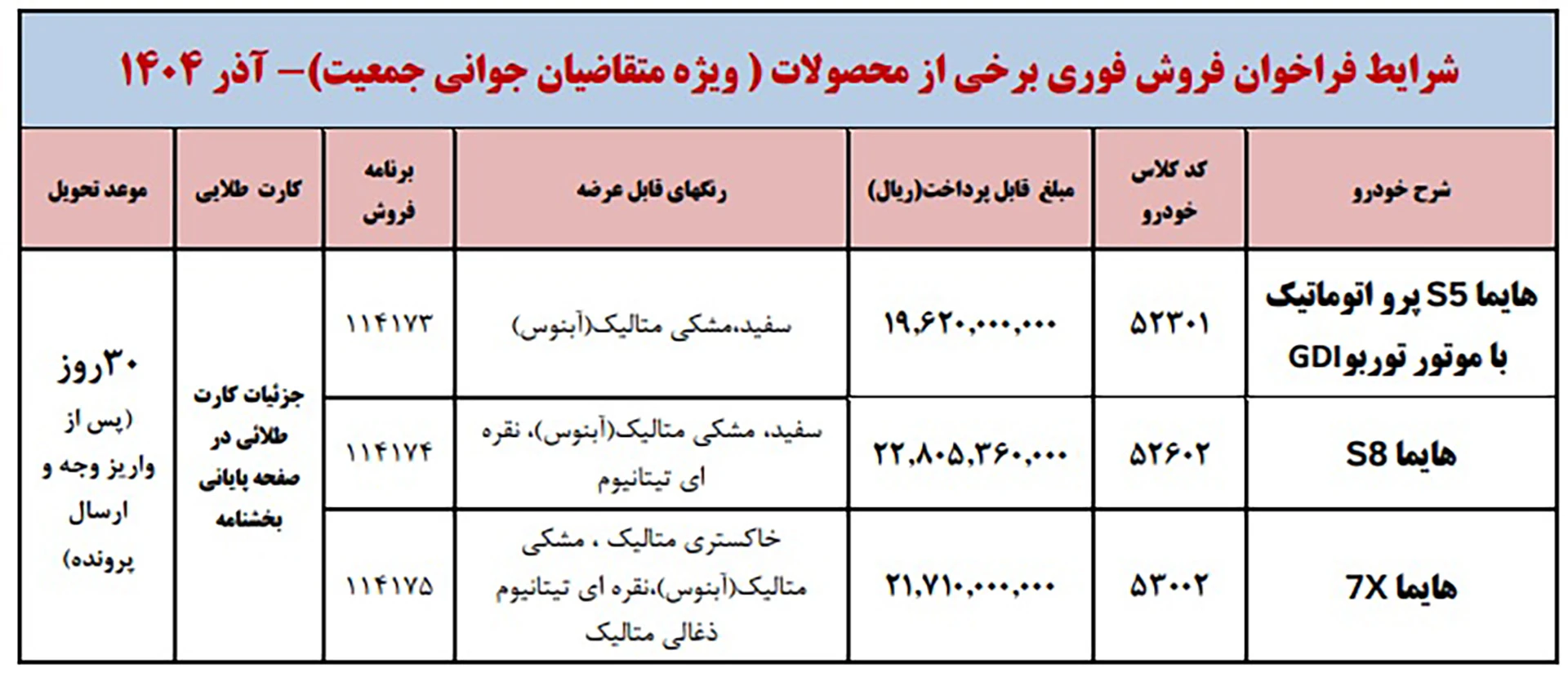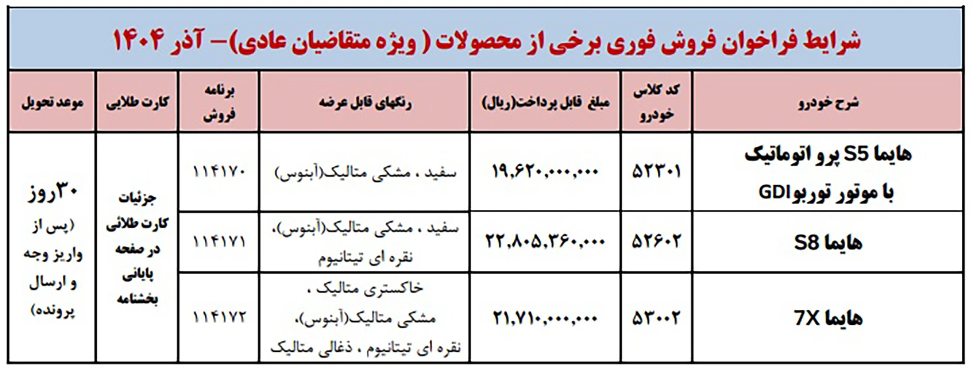 در این طرح، سه محصول هایما S5 پرو اتوماتیک (توربو GDI)، هایما S8 و هایما 7X با مدل ۱۴۰۴ و موعد تحویل 30 روزه عرضه میشوند. بر اساس جدول منتشرشده در بخشنامه، هایما S5 پرو اتوماتیک با کد کلاس ۵۲۳۰۱ در دو رنگ سفید و مشکی متالیک (آبنوس) و با قیمت ۱۹,۶۲۰,۰۰۰,۰۰۰ ریال عرضه میشود. همچنین هایما S8 با کد کلاس ۵۲۶۰۲ در رنگهای سفید، مشکی متالیک و نقرهای تیتانیوم و با قیمت قطعی ۲۲,۸۰۵,۳۶۰,۰۰۰ ریال در اختیار متقاضیان قرار میگیرد. سومین محصول این طرح نیز هایما 7X با کد کلاس ۵۳۰۰۲ است که در رنگهای خاکستری، مشکی، نقرهای و ذغالی با قیمت نهایی ۲۱,۷۱۰,۰۰۰,۰۰۰ ریال عرضه شده است. موعد تحویل تمامی خودروهای مذکور، سی روز پس از تکمیل پرونده و واریز وجه اعلام شده است.