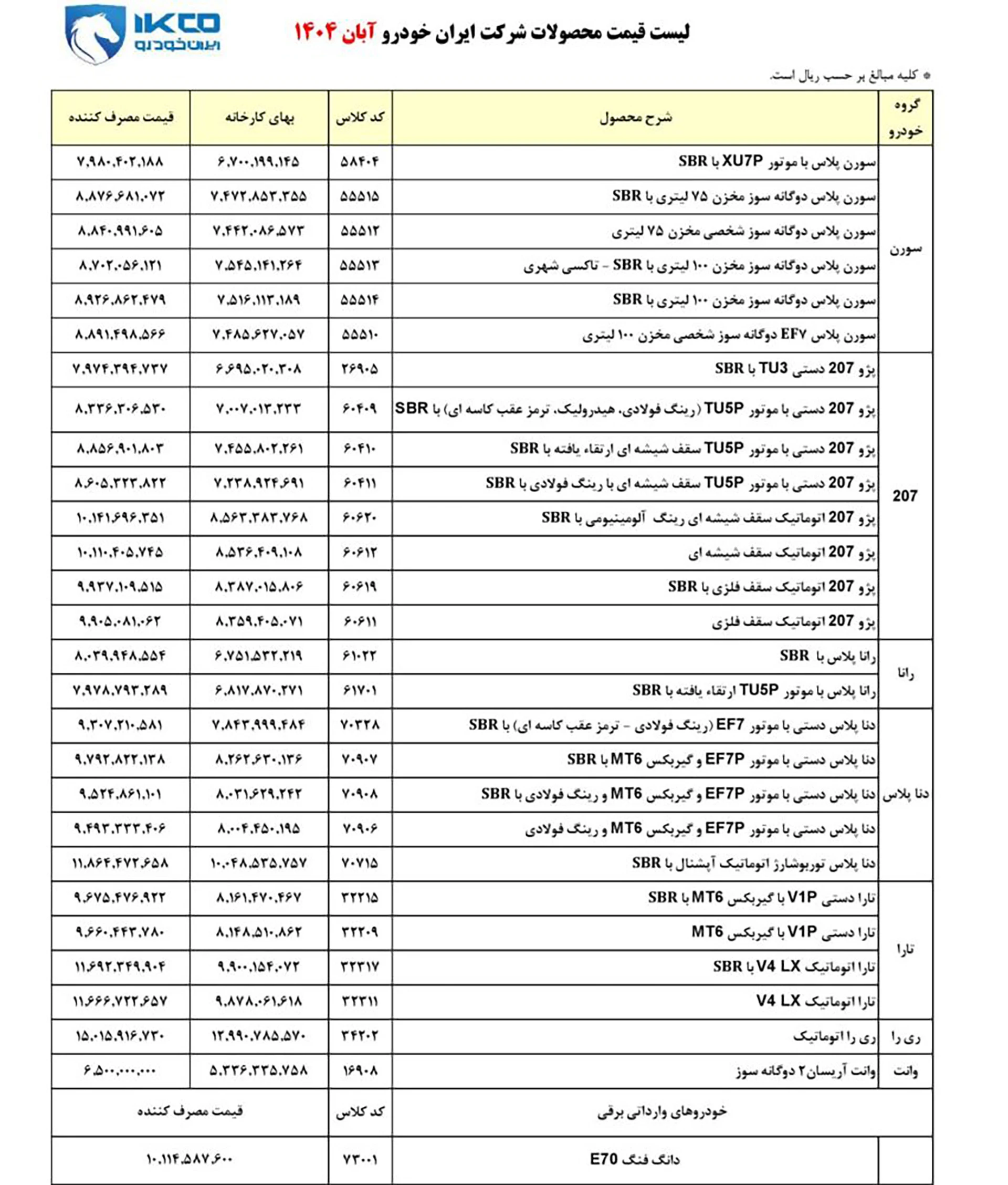 شرکت ایران خودرو امروز شنبه سوم آبان ماه ۱۴۰۴ لیست قیمت جدید و نهایی کلیه محصولات خود را ویژه مصرف کننده نهایی منتشر کرد.