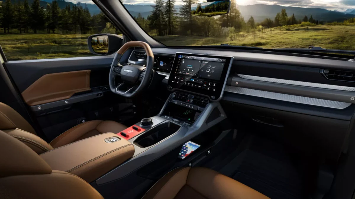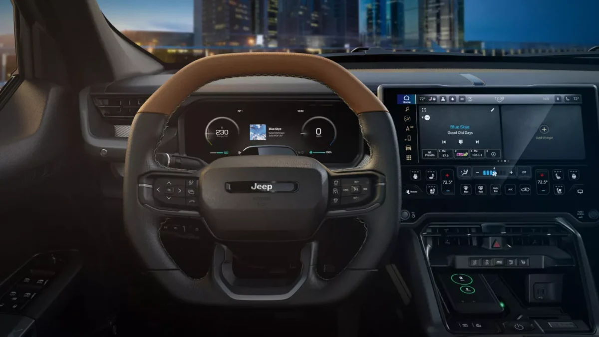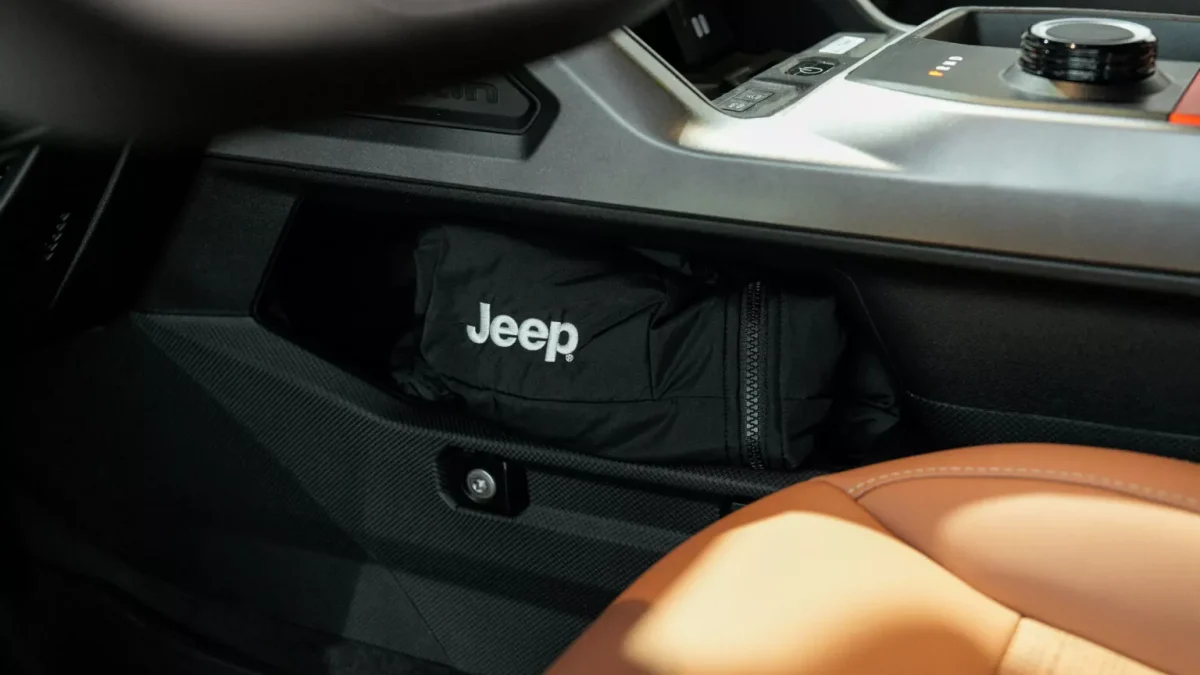 درون کابین نیز همان ترکیب سنت و نوآوری دیده میشود. متریال مقاوم با فناوری روز ادغام شدهاند تا فضایی همزمان کاربردی و مدرن ایجاد کنند. داشبورد طراحی افقی دارد و نوار دستگیرهای در سمت سرنشین نصب شده که یادآور جیپهای کلاسیک است. گسترهی نمایشگر دیجیتال روی داشبورد ۲۶ اینچ است و از دو قسمت تشکیل میشود: کلاستر دیجیتال ۱۲.۳ اینچی و صفحه لمسی مرکزی ۱۴.۵ اینچی که بزرگترین نمایشگر تاریخ جیپ به شمار میرود. سیستم نرمافزاری Uconnect 5 ضمن نمایش اطلاعات مسیر و وضعیت خودرو، قابلیت نشان دادن نقشه شیبها و زاویههای بدنه در مسیر آفرود را دارد. یک ریل ماژولار نیز در بالای داشبورد تعبیه شده تا رانندگان بتوانند دوربینهای ماجراجویی مانند GoPro را روی آن نصب کنند.