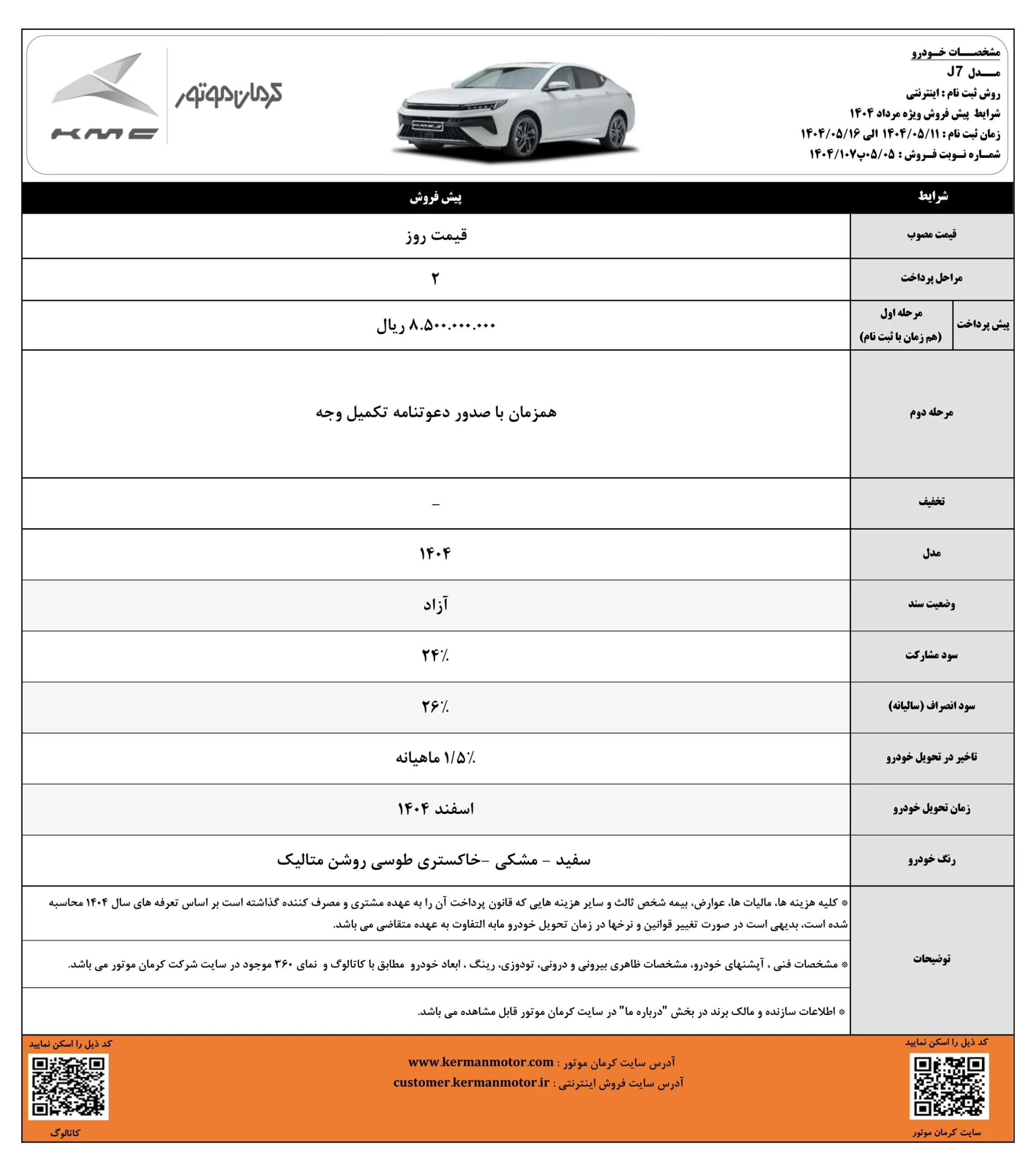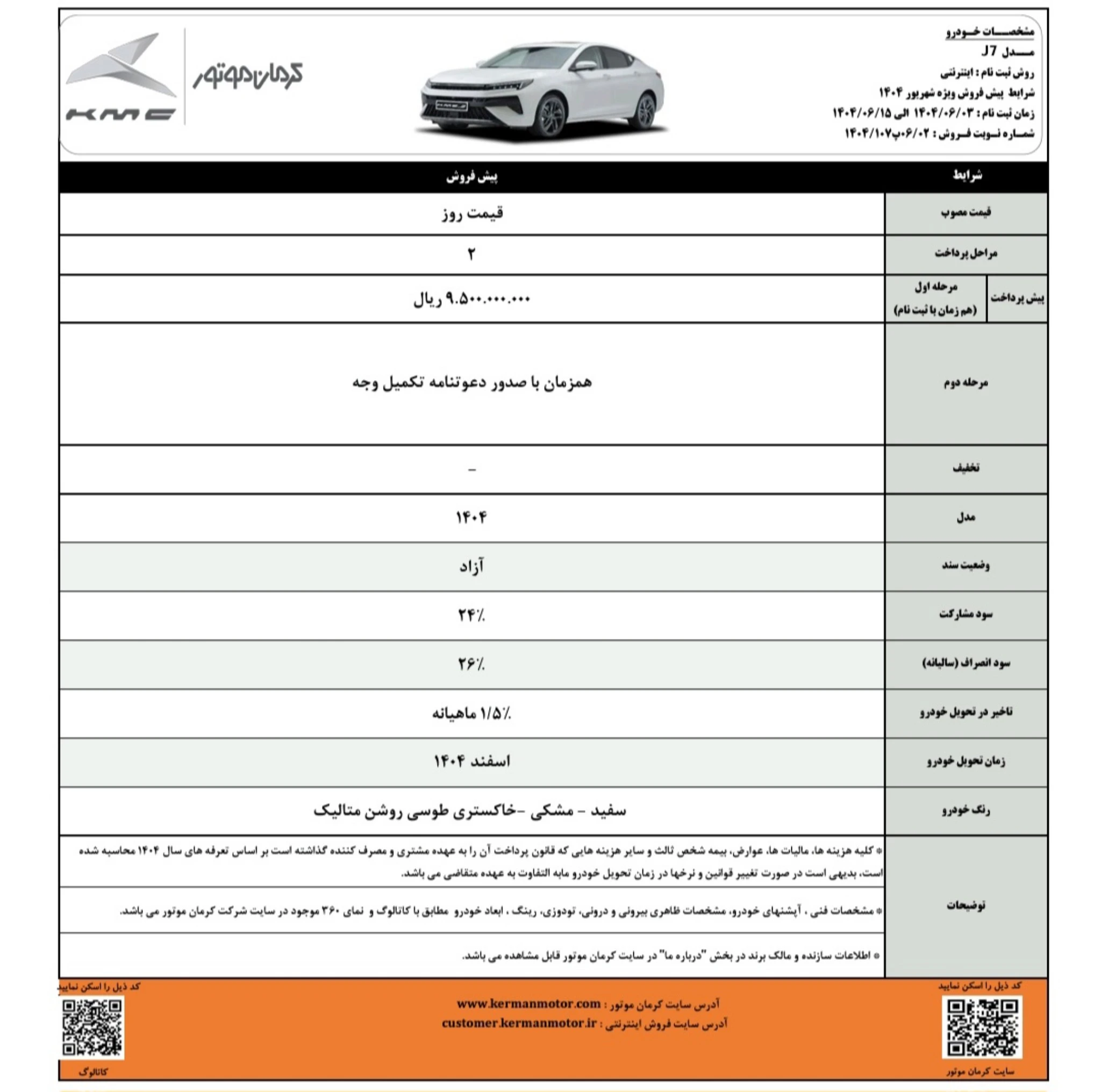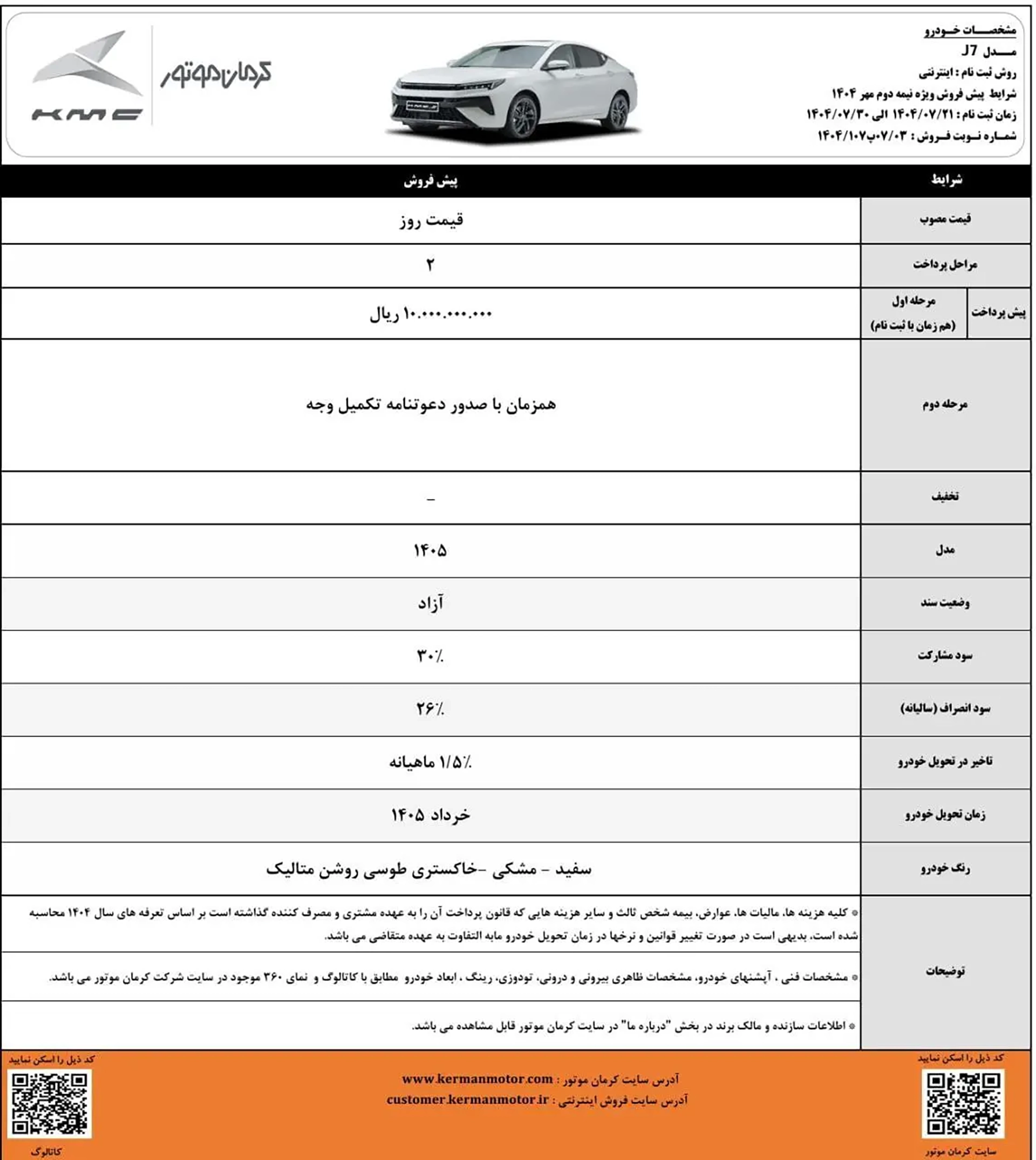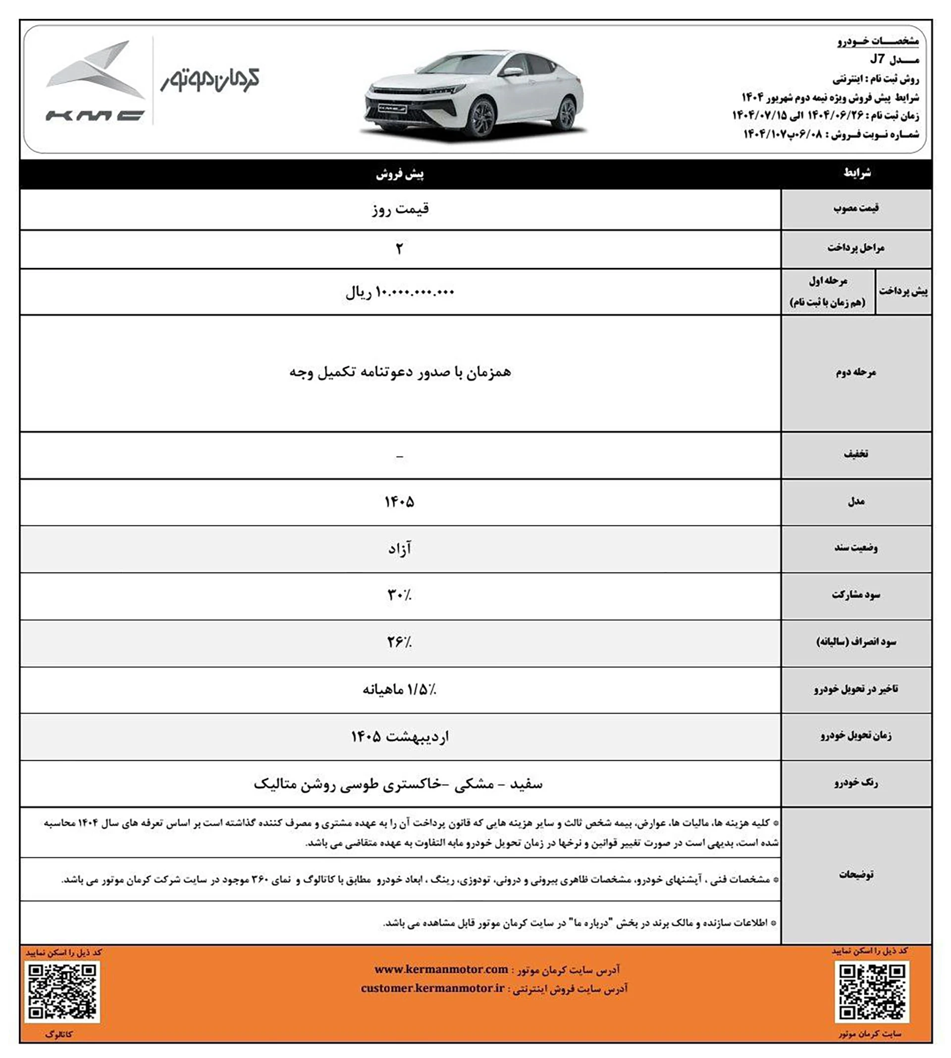 گروه خودروسازی کرمان موتور با صدور اطلاعیهای رسمی، شرایط پیشفروش سدان کی ام سی J7 را برای شهریور 1404 اعلام کرده است. طبق این اطلاعیه، علاقهمندان میتوانند از روز چهارشنبه 26 شهریور تا 15 مهر 1404 برای ثبتنام و واریز وجه اقدام کنند.