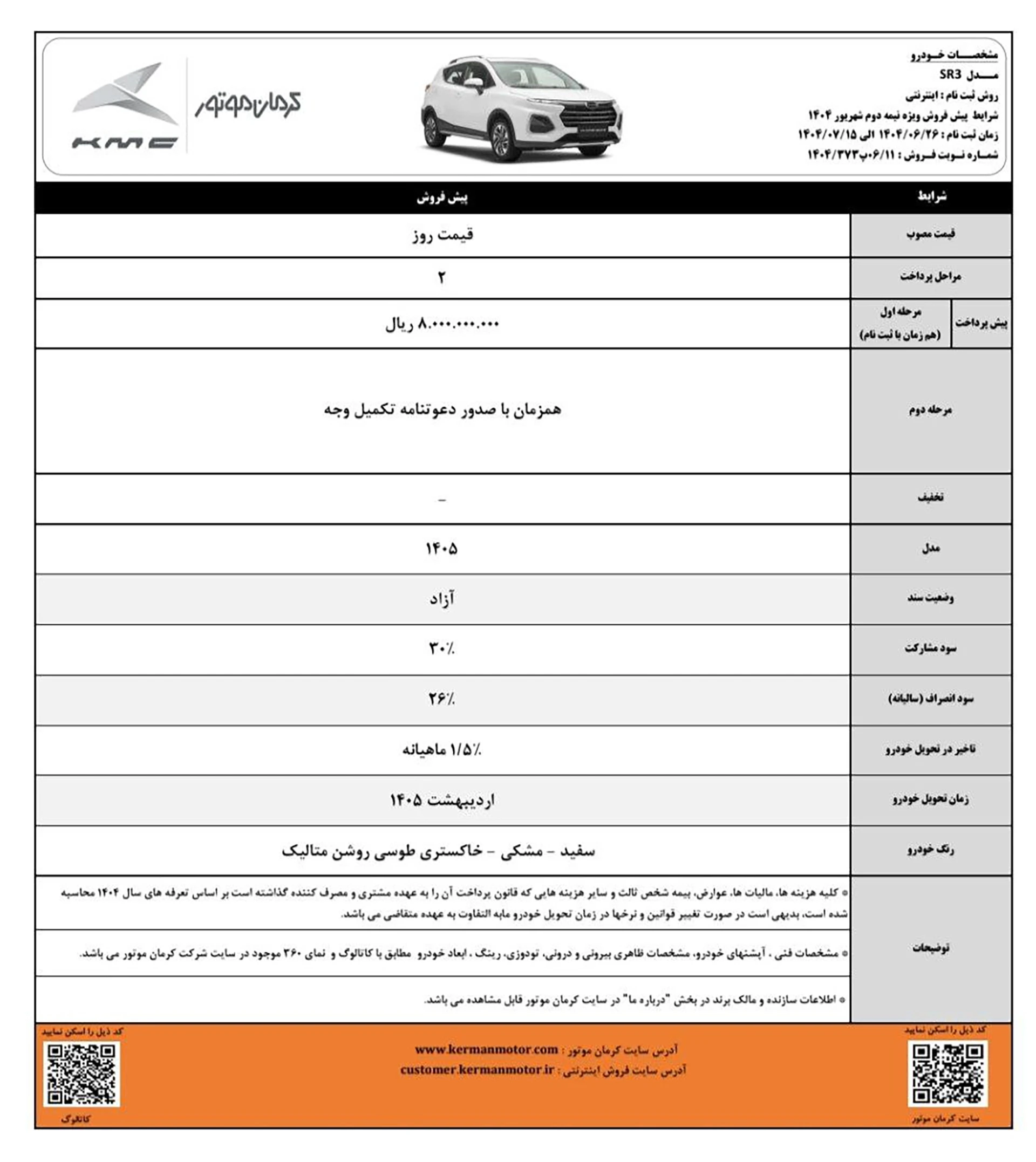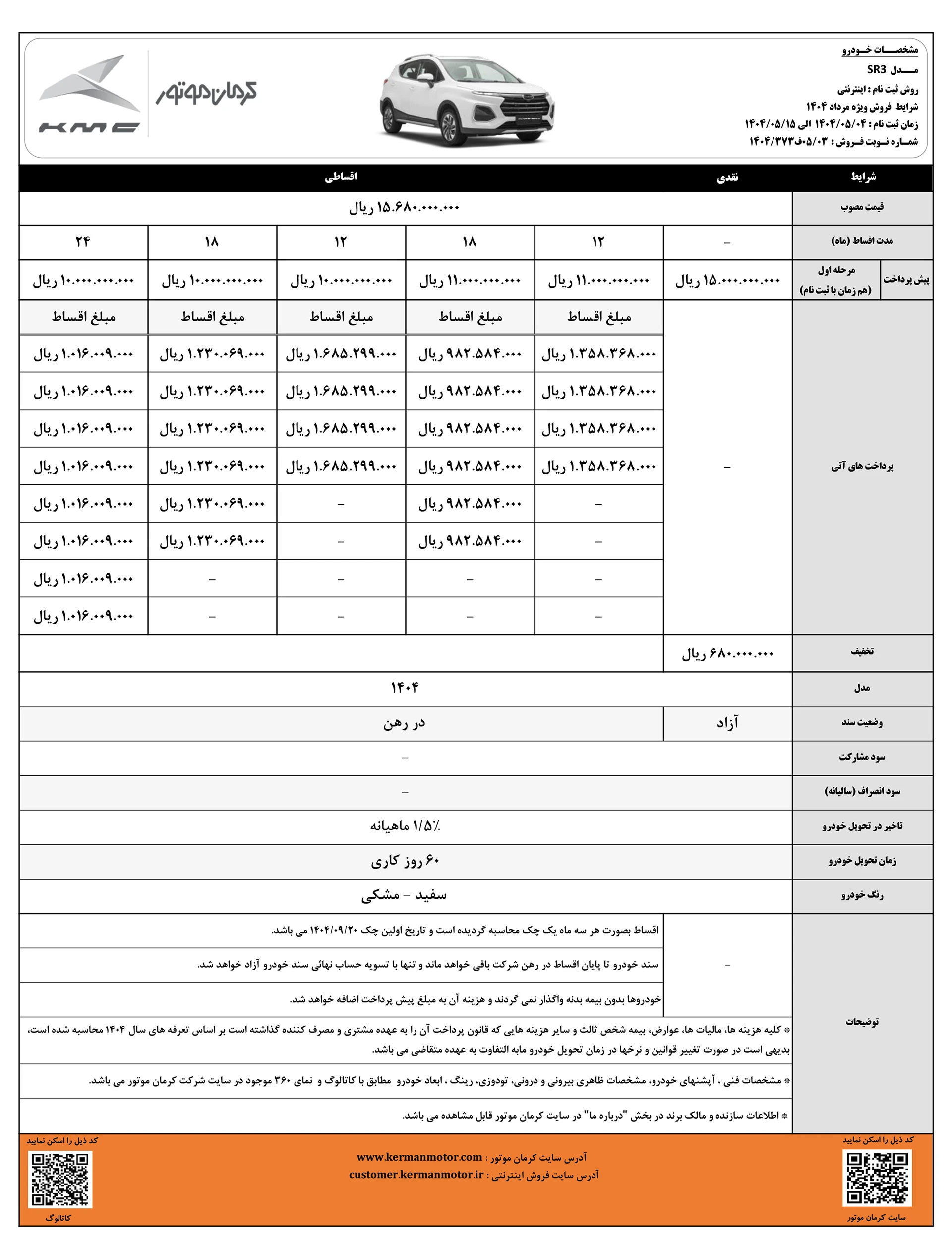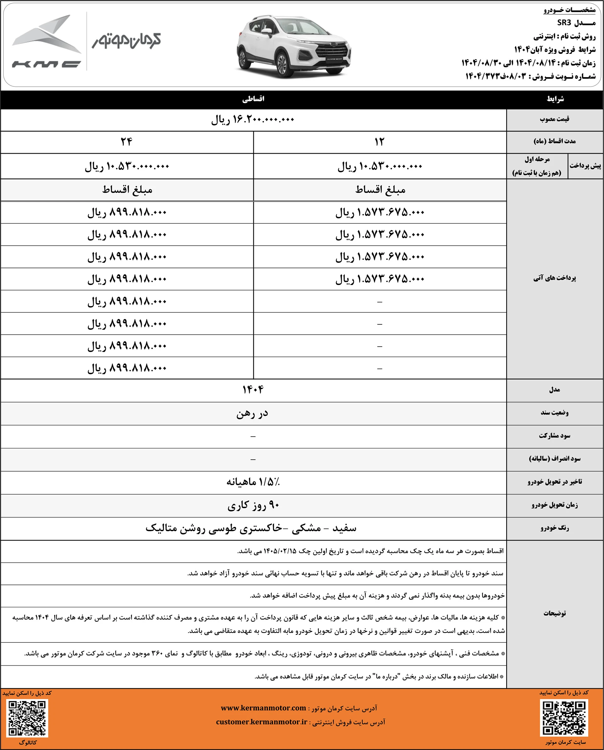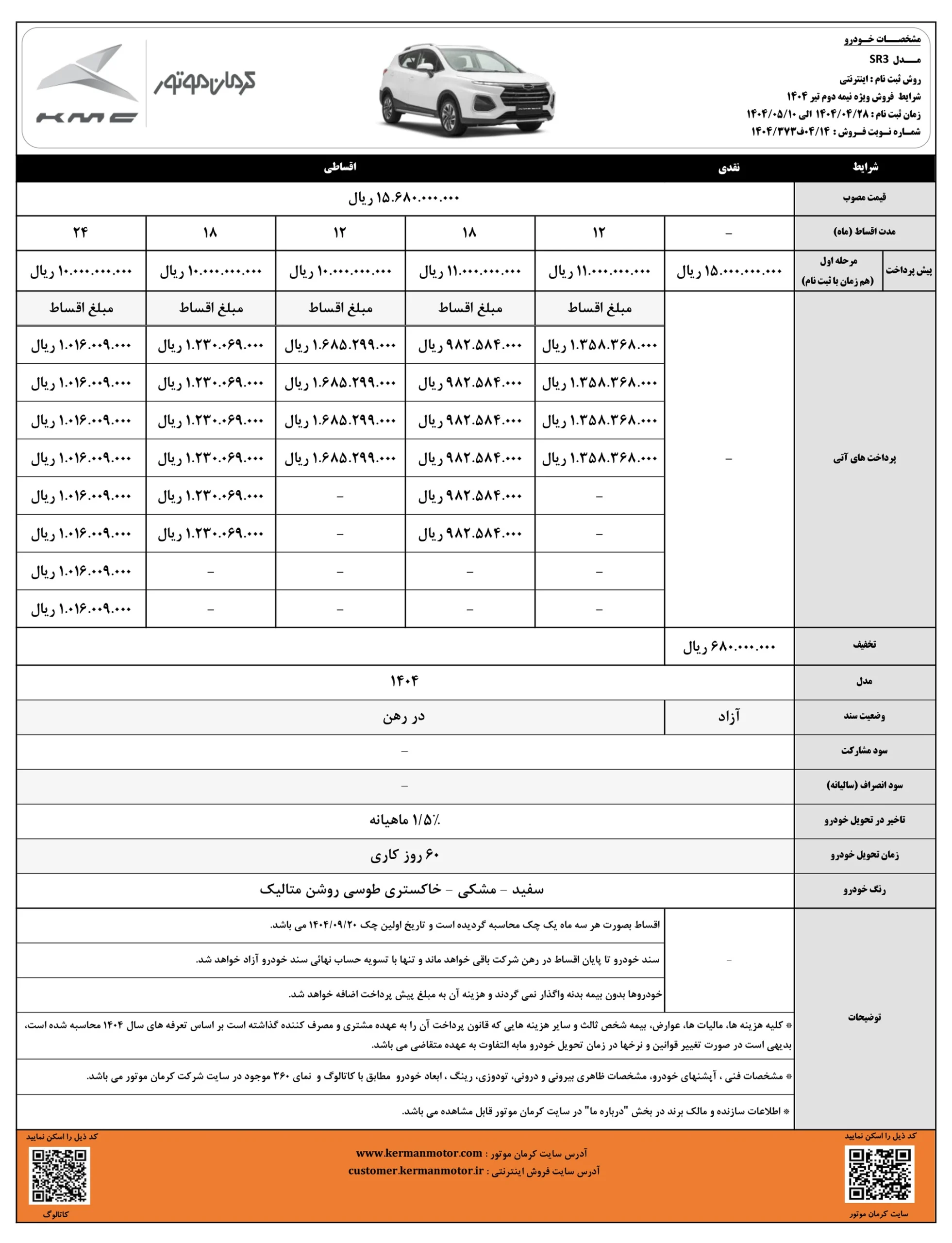 شرایط فروش نقدی و اقساطی کی ام سی SR3 – تیرماه ۱۴۰۴
