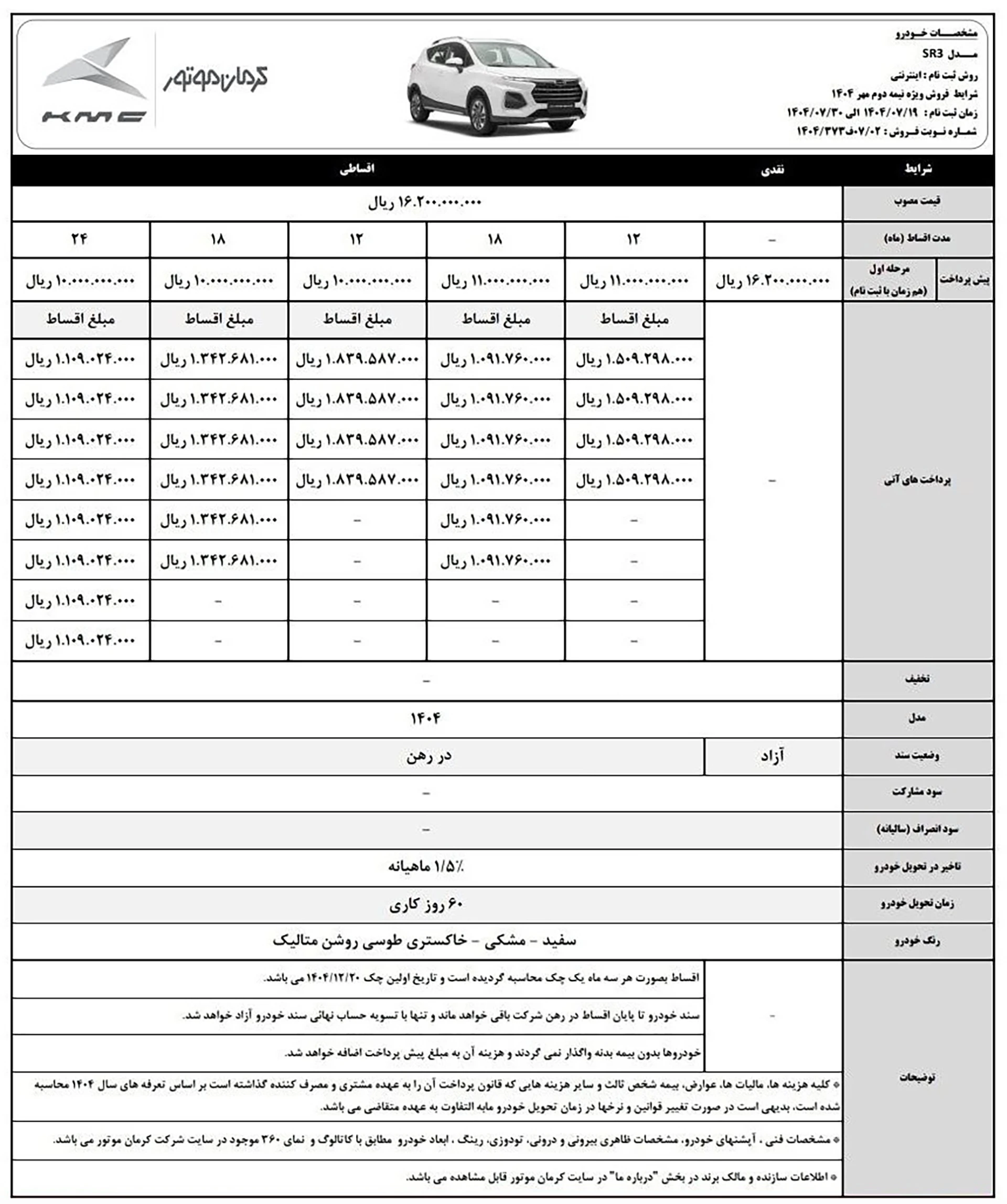 گروه خودروسازی کرمان موتور طی اطلاعیهای جدید، شرایط فروش نقدی و اقساطی کراساوور کی ام سی SR3 را برای تیرماه سال ۱۴۰۴ اعلام کرده است. بر اساس این اطلاعیه، تمامی متقاضیان میتوانند از روز شنبه ۲۸ تیرماه تا 10 مرداد ماه نسبت به ثبتنام و پرداخت وجه اقدام نمایند.