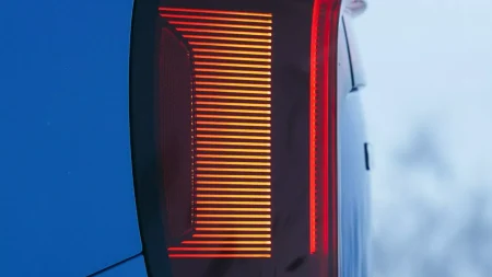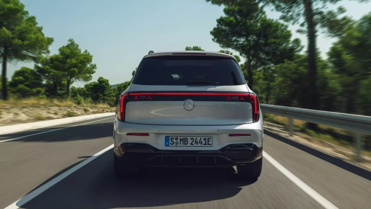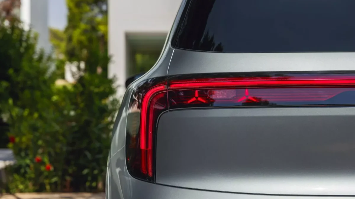 نمای عقب بیش از هر بخش دیگری جلبتوجه میکند. طراحی آن بهوضوح از کانسپت Vision EQXX الهام گرفته شده و چراغهای عمودی آن توسط یک نوار نورانی متصل شدهاند. الگوی نورپردازی ستارهای نیز در عقب تکرار شده تا هماهنگی ظاهری خودرو حفظ شود.
