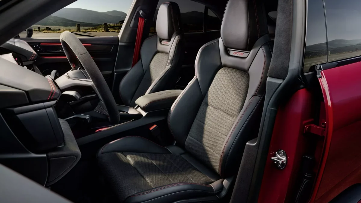 در فضای داخلی، پوشش ترکیبی Race-Tex و چرم مشکی فضای لوکس و پویا ایجاد کرده است. خریداران میتوانند رنگ دوخت صندلیها و تریم داخلی را با رنگ بدنه هماهنگ کنند. نشان GTS نیز روی فرمان، صندلیهای اسپرت تطبیقی ۱۸ حالته و صفحهنمایش دیجیتال قرار دارد و هویت اسپرت خودرو را پررنگتر میکند.