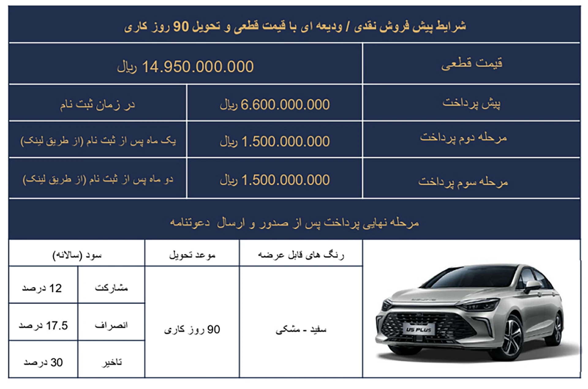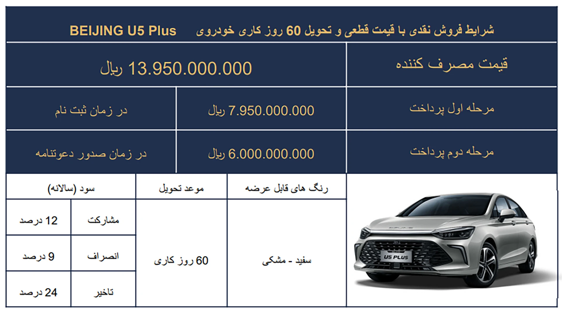 نرخ سود مشارکت در این طرح به صورت سالانه 12 درصد، سود انصراف 17.5 درصد و جریمه تأخیر 30 درصد اعلام شده است. موعد تحویل خودرو 90 روز کاری تعیین گردیده و خودرو در دو رنگ سفید و مشکی عرضه خواهد شد. این شرایط به همراه مشخصات و امکانات متنوع، بیجینگ U5 پلاس را به یکی از گزینههای قابل توجه بازار سدانها تبدیل میکند.