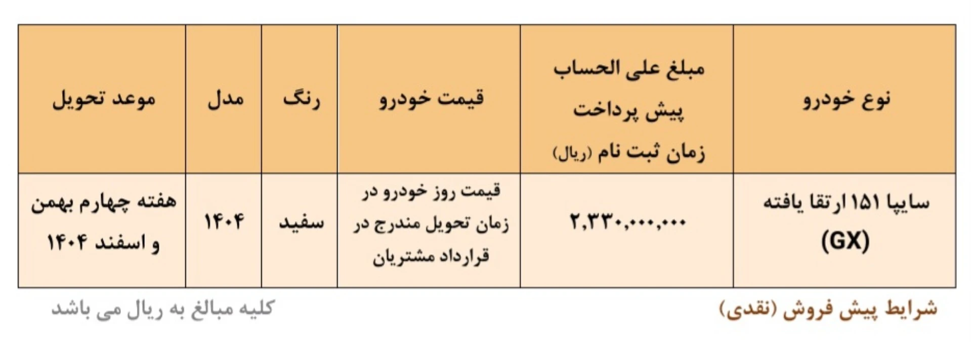 همچنین در قالب طرح پیشفروش نقدی، سایپا ۱۵۱ ارتقاءیافته GX با موعد تحویل بهمن و اسفند سال جاری در اختیار متقاضیان قرار خواهد گرفت.