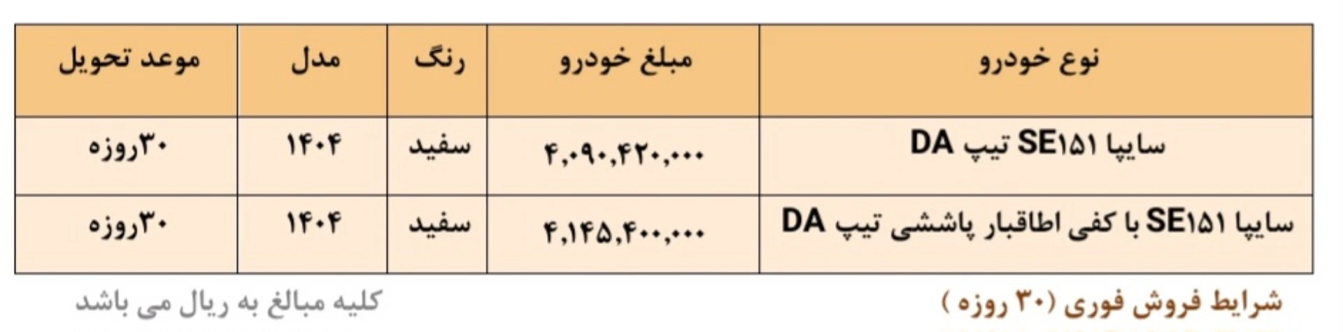 در بخش فروش فوری، خودروهای سایپا ۱۵۱ SE تیپ DA و سایپا ۱۵۱ SE با کفی اطاقبار پاششی تیپ DA با موعد تحویل ۳۰ روزه عرضه میشوند.