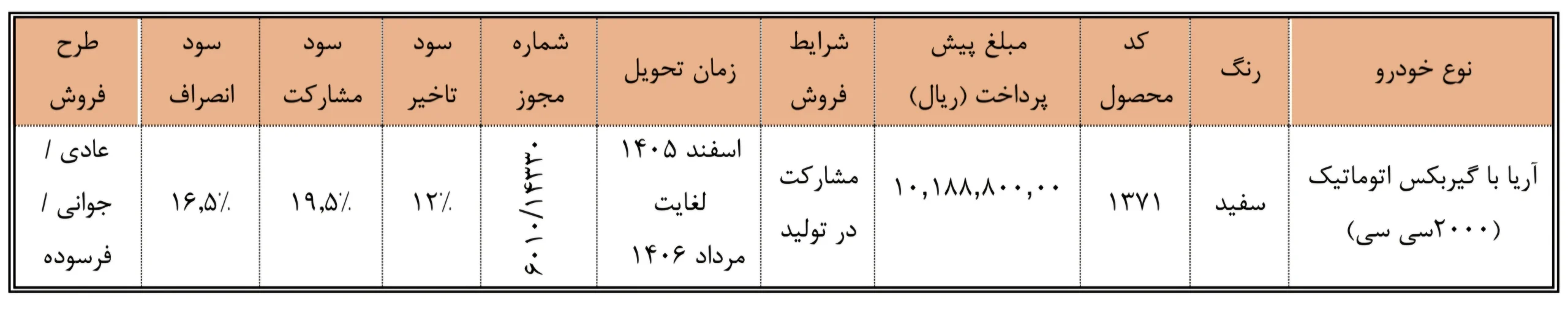 قرعهکشی طرح فروش مشارکت در تولید خودروی جدید آریا با حضور نمایندگان نهادهای نظارتی و مراجع ذیصلاح برگزار شد. نتایج قرعهکشی امروز از طریق ارسال پیامک به منتخبان اطلاعرسانی میشود. همچنین متقاضیان میتوانند با مراجعه به پایگاه رسمی گروه خودروسازی سایپا به نشانی www.saipacorp.com یا سامانه فروش اینترنتی سایپا، از وضعیت ثبتنام خود مطلع شوند.
