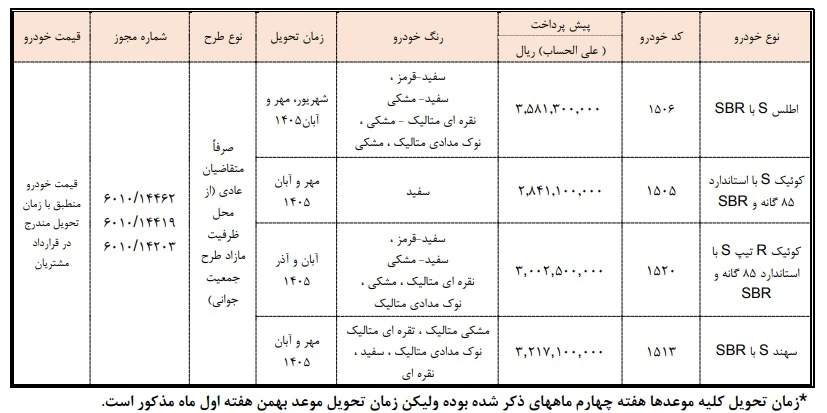 بر اساس این طرح فروش که صرفا به متقاضیان عادی از محل ظرفیت مازاد طرح جوانی جمعیت اختصاص دارد، خودرو اطلس S مجهز به SBR با پیش پرداخت مبلغ ۳۵۸ میلیون و ۱۳۰ هزار تومان، خودرو کوییک S با پیش پرداخت ۲۸۴ میلیون و ۱۱۰ هزار تومان، خودرو کوییک R تیپ اس با پیش پرداخت ۳۰۰ میلیون و ۲۵۰ هزار تومان و خودرو سهند S با پیش پرداخت ۳۲۱ میلیون ۷۱۰ هزار تومان خدمت مشتریان عرضه میشوند. سایر جزئیات مربوط به موعد و رنگهای عرضه شده در جدول فوق قابل مشاهده است.