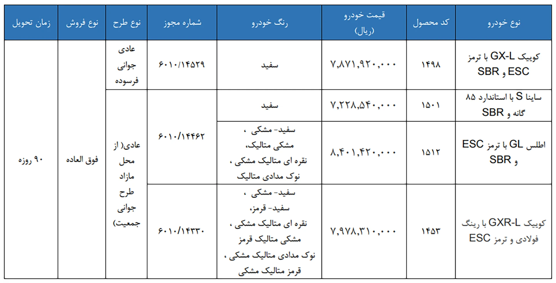 | نام خودرو | نوع فروش | قیمت(تومان) | موعد تحویل |