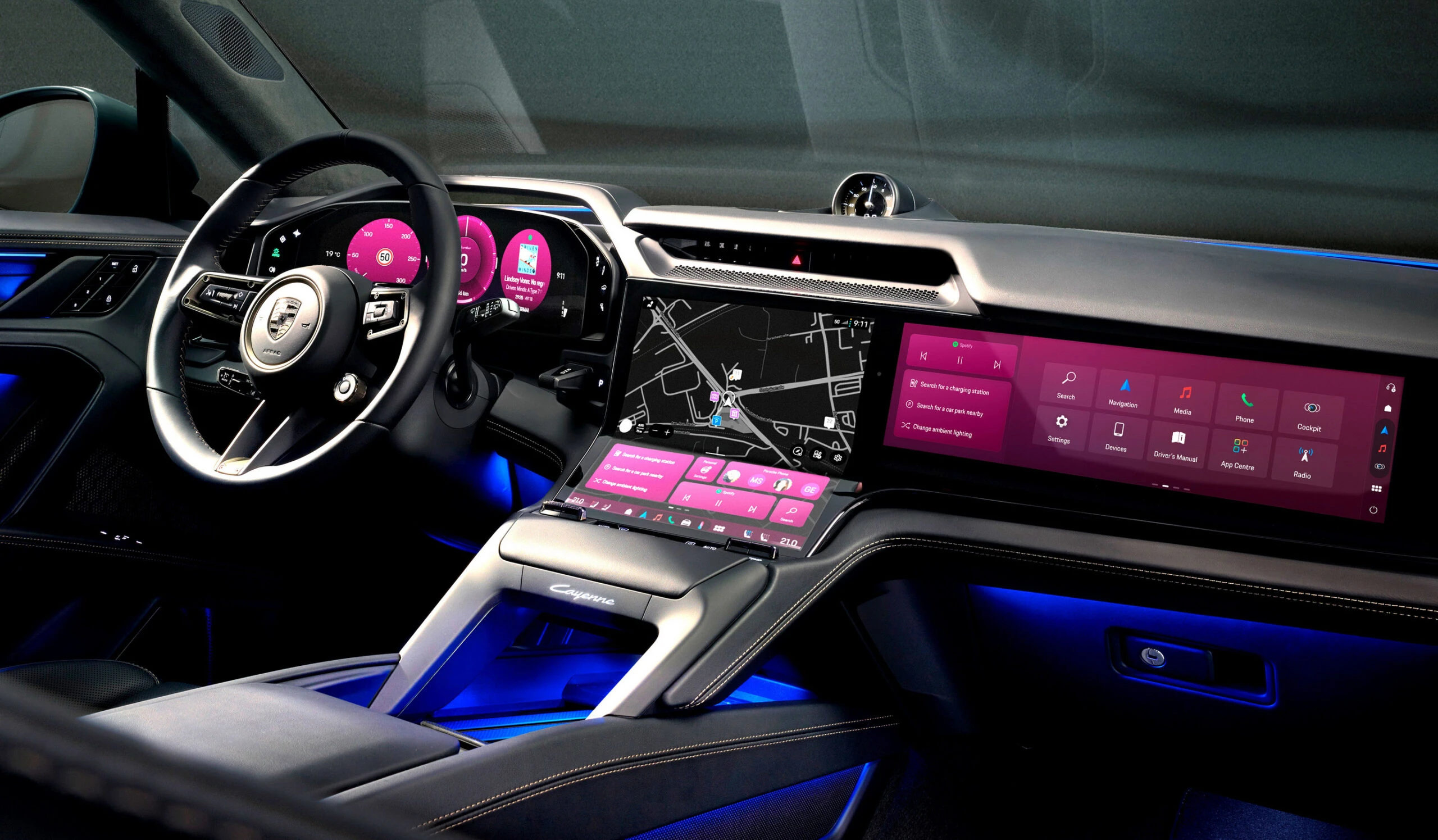در میان خودروهای لوکس، پورشه کاین الکتریک نمونهای شاخص از این روند به شمار میرود. این خودروی جدید با تمرکز بر تجربهای همهجانبه برای سرنشینان طراحی شده است. راننده از یک نمایشگر خمیده دیجیتالی OLED بهعنوان کلاستر بهره میبرد و در مرکز داشبورد، صفحهای لمسی به اندازه ۱۴٫۲۵ اینچ قرار دارد. علاوه بر این، پورشه امکان نصب یک نمایشگر واقعیت افزوده ۸۷ اینچی را بهعنوان هدآپدیسپلی گسترده بر روی شیشه جلو فراهم کرده است تا دادههای ضروری مستقیماً در میدان دید راننده نمایش داده شوند.