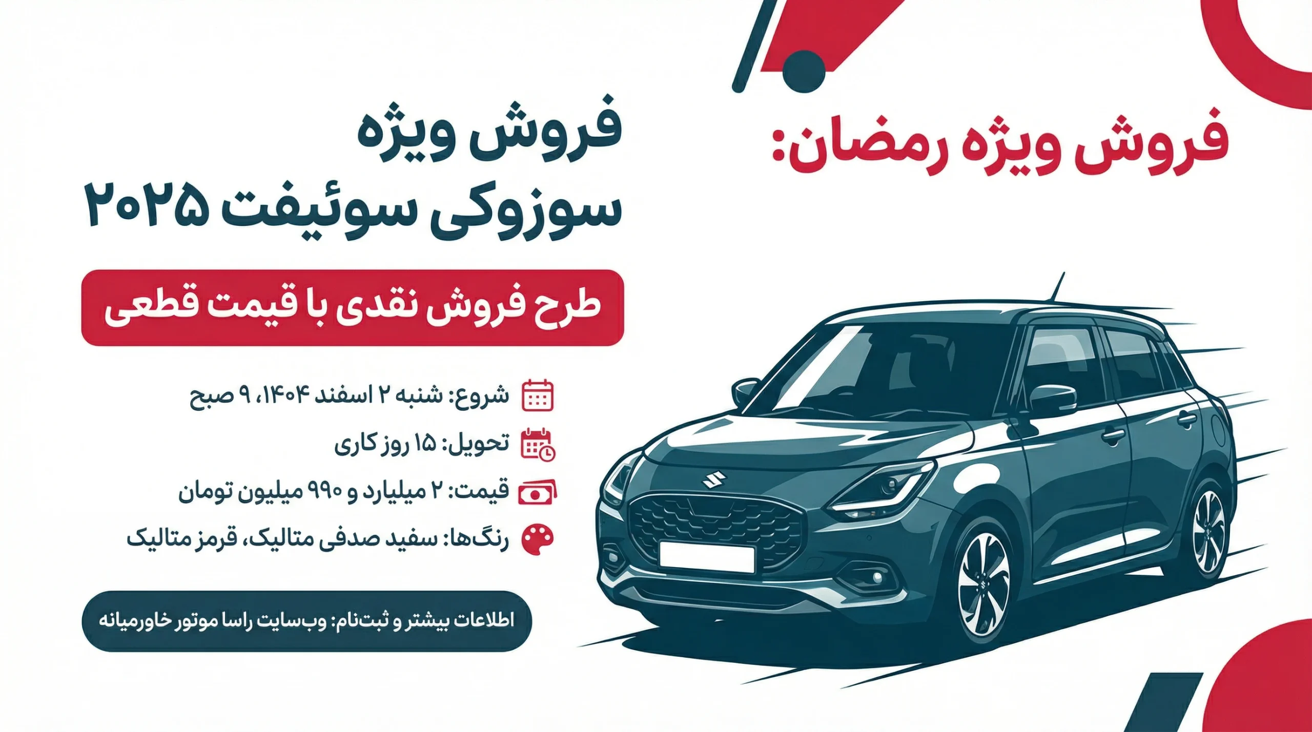 همزمان با فرارسیدن ماه مبارک رمضان، راسا موتور خاورمیانه طرح فروش نقدی ویژه هاچبک سوزوکی سوئیفت مدل ۲۰۲۵ را با قیمت قطعی آغاز میکند. این طرح از ساعت ۹ صبح روز شنبه 2 اسفند 1404 فعال خواهد شد و تا زمان تکمیل ظرفیت ادامه دارد. بر اساس اعلام این شرکت، خودروها حداکثر ظرف ۱۵ روز کاری پس از واریز کامل وجه به خریداران تحویل داده میشوند و تمامی هزینههای قانونی نیز در قیمت نهایی لحاظ شده است.