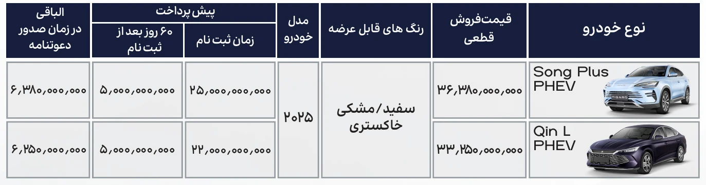 متقاضیان محترم سامانه یکپارچه فروش خودروهای وارداتی ار روز شنبه 11 مرداد الی چهارنشبه 15 مرداد این امکان را دارند که فرایند ثبتنام خودروهای بی وای دی شرکت تیگارد موتور شامل سانگ پلاس پلاگین هیبریدی و چین L پلاگین هیبریدی را تکمیل نموده و محصول موردنظر خود را به شیوه پیشفروش فوقالعاده با قیمت قطعی، براساس جدول اعلام شده، انتخاب نمایند.